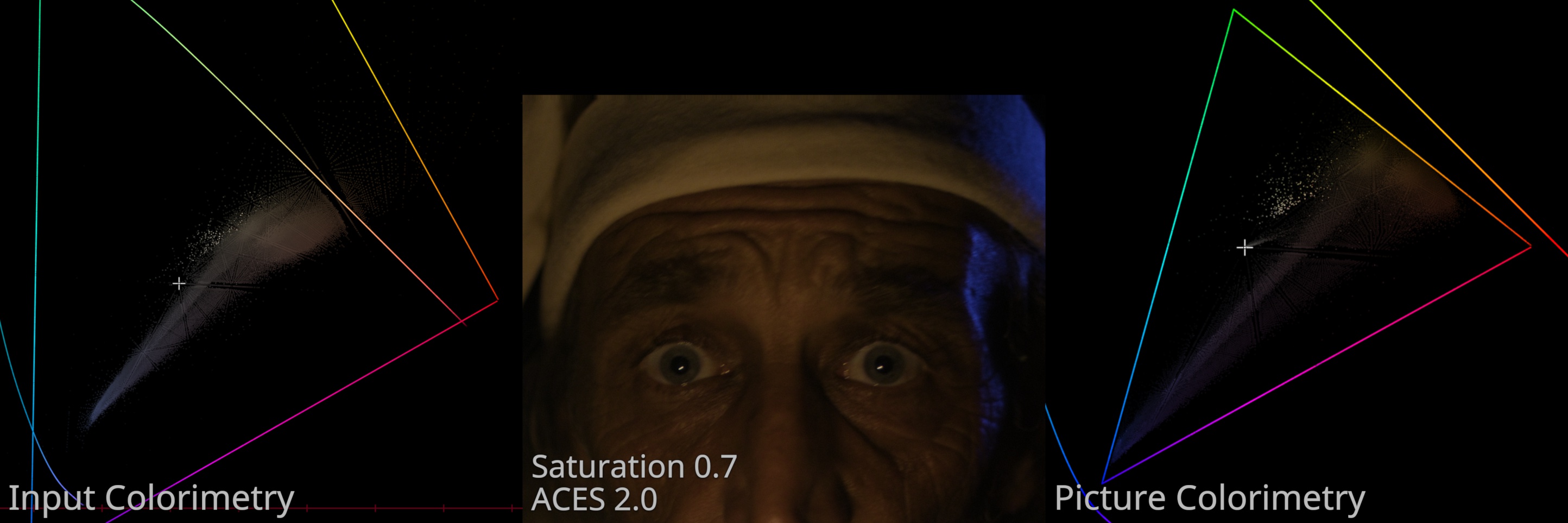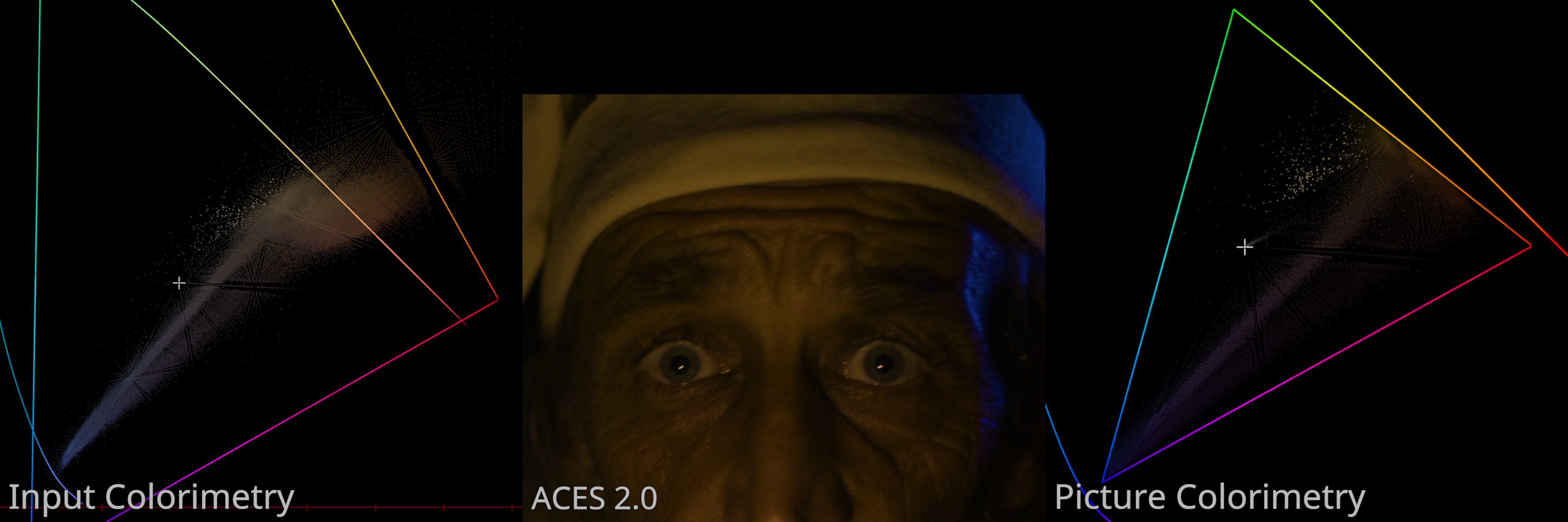 Here is a plot of CIE 1931 xy chromaticity for the input “scene-referred” colorimetry on the left, the picture formed by ACES 2.0 Picture Formation in the middle, and the colorimetry of the formed picture on the right.