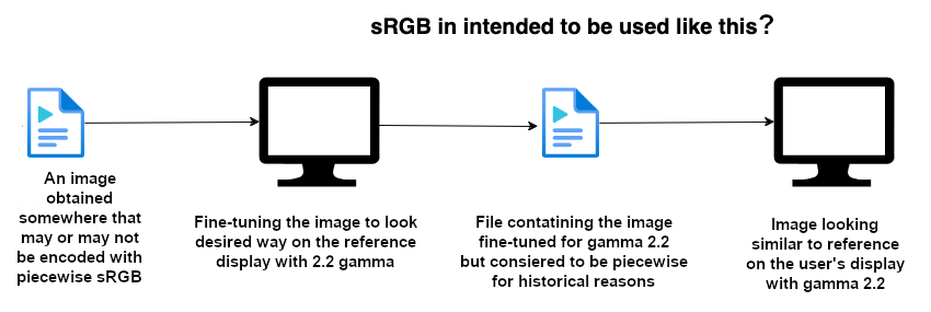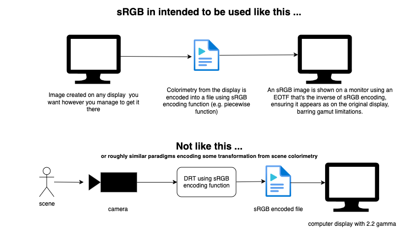Thomas’ suggestion that the utterance of “sRGB” implies the entire chain, aka the whole three stage sandwich. This is, as best as I can see, correct.
